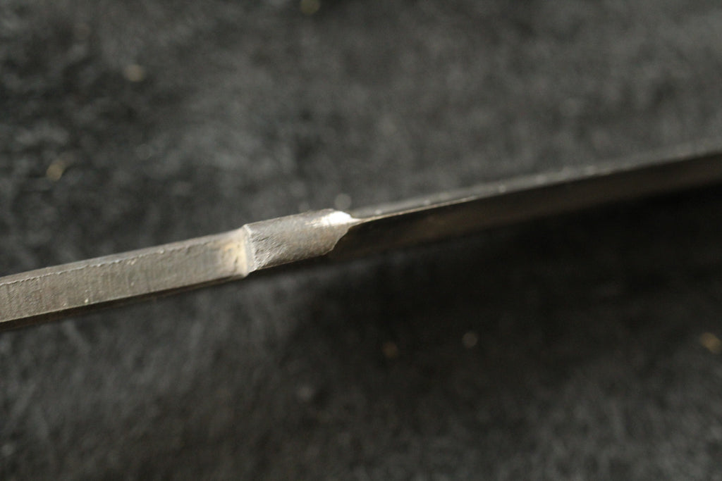 Es ist wichtig zu beachten, dass es geringfügige Unterschiede geben wird, da es schwierig ist, ein Messer mit genau den Spezifikationen für Größe, Dicke und Design herzustellen. *Größen können bis zu ca. 5 mm variieren. Es gibt ein paar winzige Rost- und Risse am Körperstahl, am Shinogi der Klinge und am Erlteil, es ist nicht defekt. Japanisches traditionelles Kurouchi-Finish.